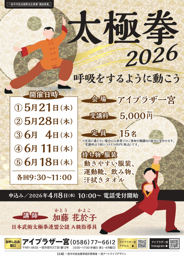 講座・ワークショップ 太極拳2026 2026年05月21日~2026年06月18日 総合案内 more 柔軟ストレッチ 2026年05月21日~2026年06月25日 総合案内 more 楽しく歌おう懐メロ俱楽部 2026年04月08日~2026年06月19日 総合案内 more 一覧はこちら