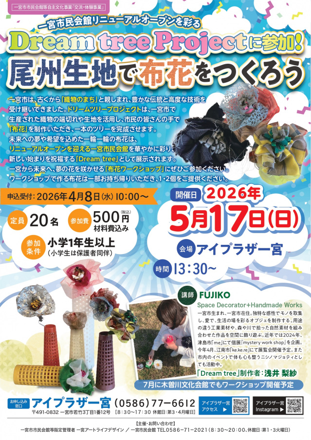 講座・ワークショップ 一宮市民会館リニューアルオープンを彩るDream tree Projectに参加!尾州生地で布花をつくろう 2026年05月17日 総合案内 more 太極拳2026 2026年05月21日~2026年06月18日 総合案内 more 柔軟ストレッチ 2026年05月21日~2026年06月25日 総合案内 more 楽しく歌おう懐メロ俱楽部 2026年04月08日~2026年06月19日 総合案内 more 一覧はこちら