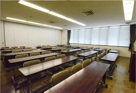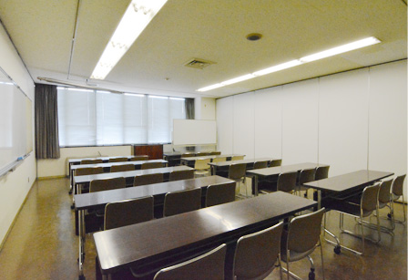 - 教室型、窓ありのお部屋です。3人掛机18脚。隣の第4会議室とは間仕切りで仕切られています。仕切りを外すと80名の会議室になります。