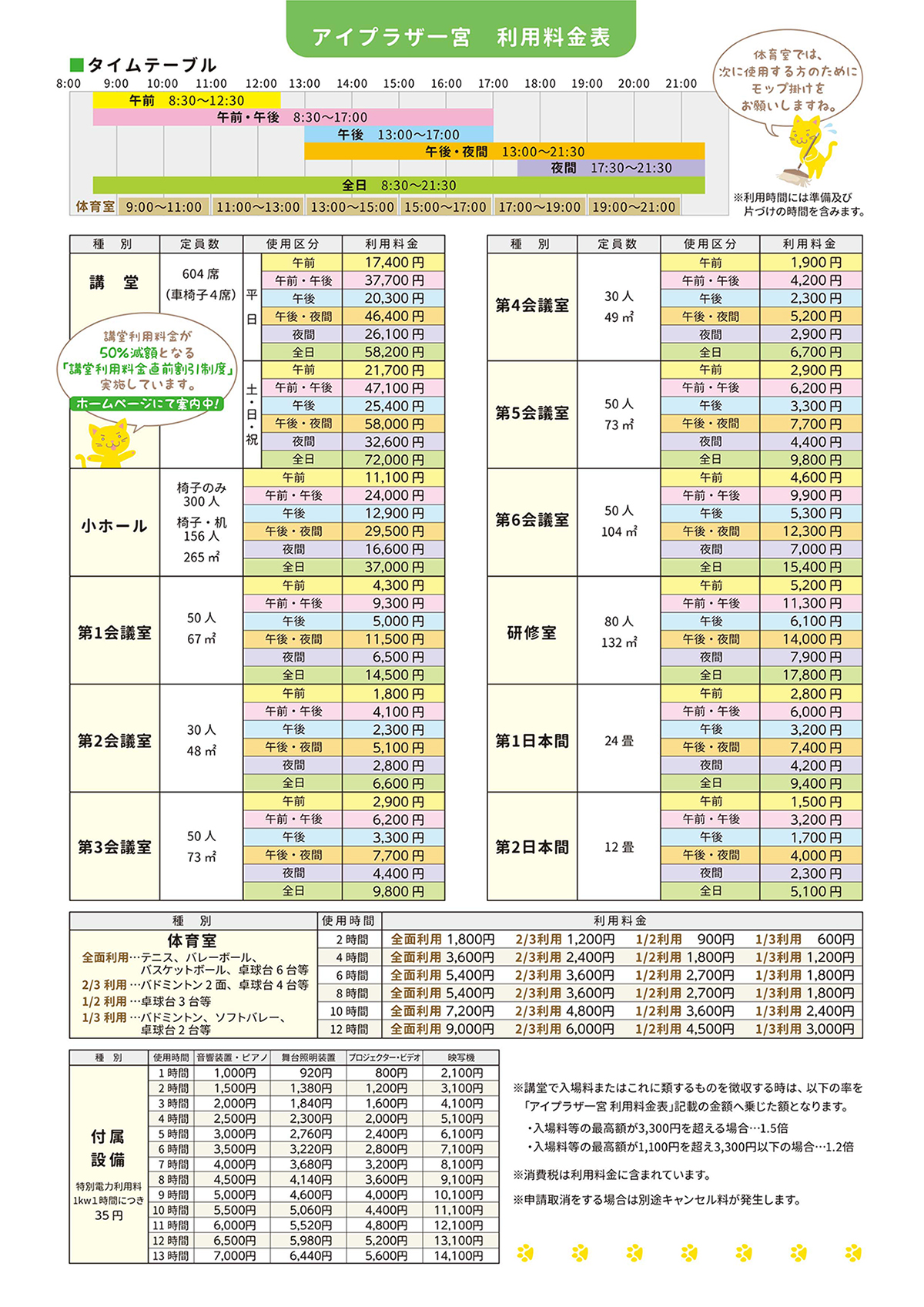 - 利用時間には、会場の準備及び後片付けの時間を含みます。