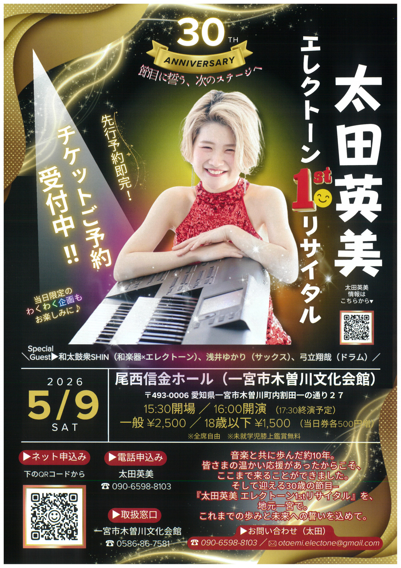 太田英美 エレクトーン1stリサイタル 2026年05月09日 貸館 30TH ★ANNIVERSARY★節目に誓う、次のステージへ 太田英美エレクトーン1stリサイタル 期日・日時 5月9日(土) 開演 開場 15:30 開演 16:00 入場方法 ■全席自由 ■一般¥2,500 / 18歳以下¥1,500 (当日券各500円増) ※未就学児膝上鑑賞無料 チケット取扱 ■窓口 ・木曽川文化会館 問い合わせ 太田英美 ☎090-6598-8103