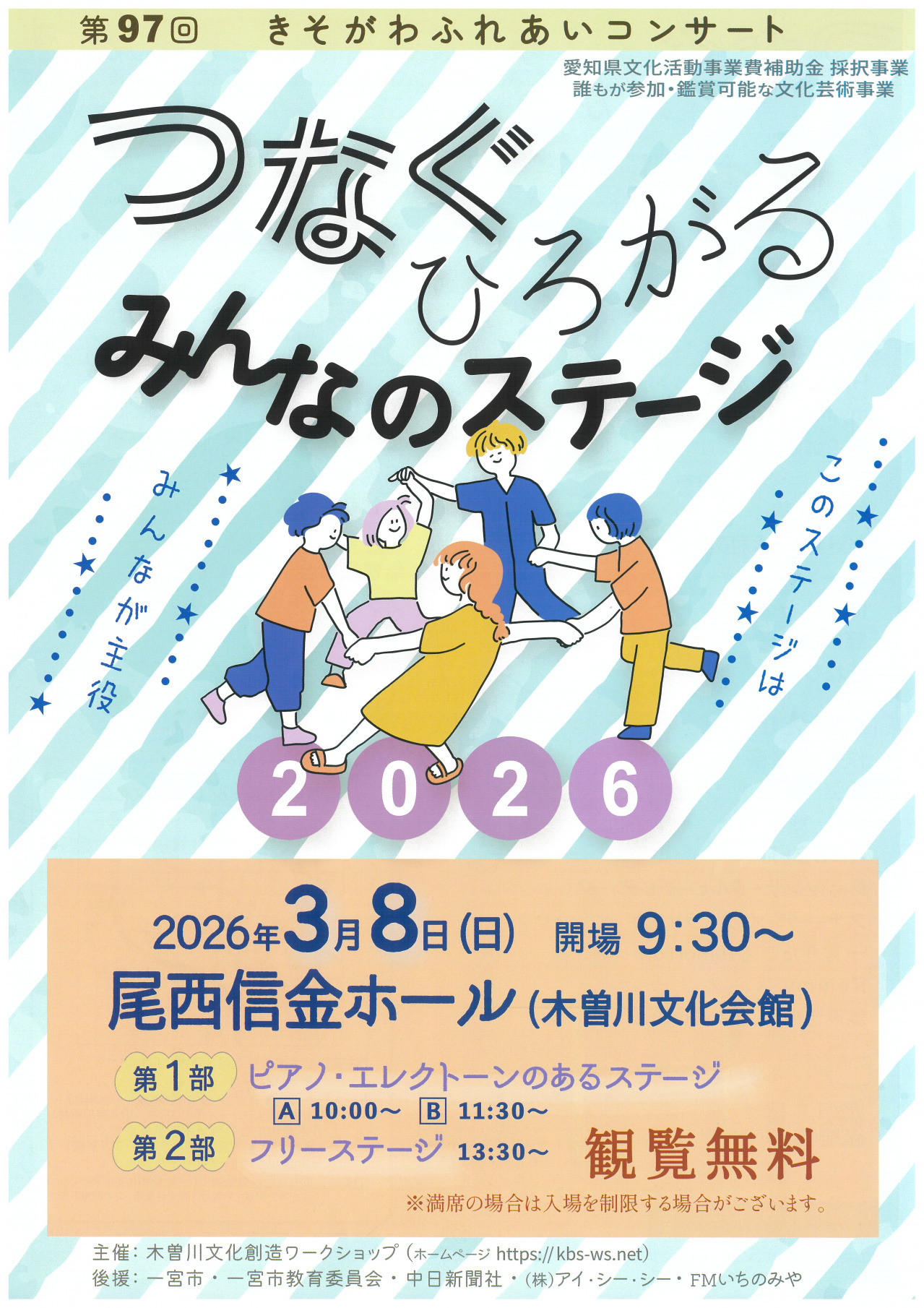 第97回 きそがわふれあいコンサート 2026年03月08日 貸館 つなぐ ひろがるみんなのステージ 2026第1部 ピアノ・エレクトーンのあるステージ第2部 フリーステージ 期日・日時 3月8日(日) 開演 開場 9:30 開演 10:00 入場方法 ■入場無料 問い合わせ ■木曽川文化創造ワークショップ 090-7025-5828(担当:佐塚)