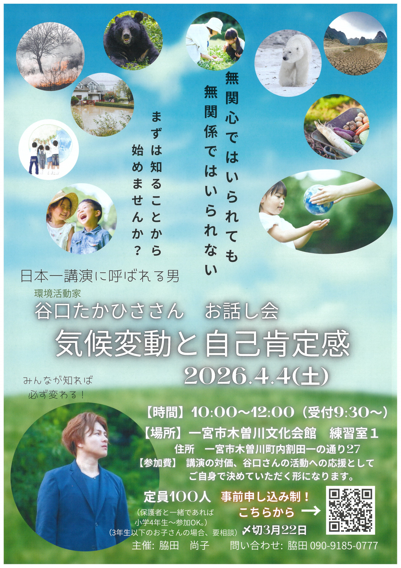 谷口たかひささん お話し会 2026年04月04日 日本一講演に呼ばれる男環境活動家谷口たかひささん お話し会気候変動と自己肯定感*練習室1 期日・日時 4月4日(土) 開演 開演 10:00 (受付 9:30~) 問い合わせ ■090-9185-0777 (脇田)