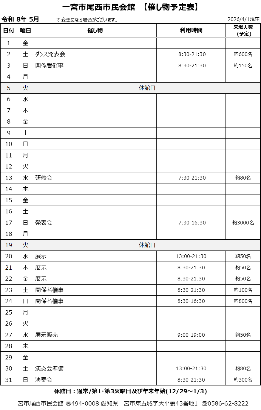 一宮市尾西市民会館の予定を下記一覧表でご確認ください。