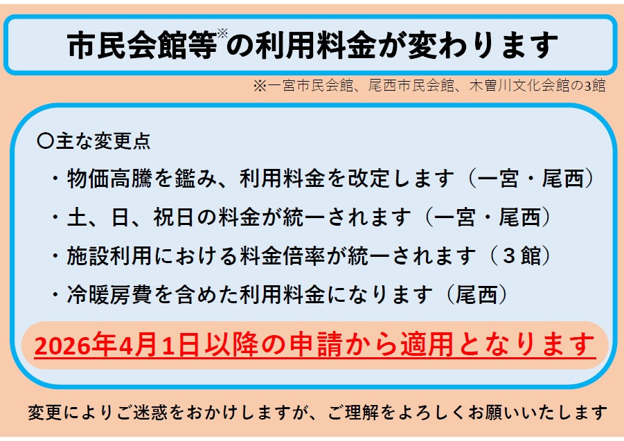 一宮市民会館及び一宮市尾西市民会館の利用時間、利用料金、3館全ての申請期間(申請開始日)が2026年4月1日より変更となります。