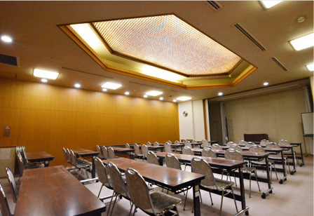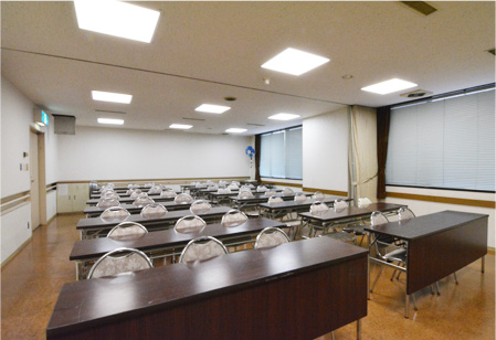 - 教室型、窓ありのお部屋です。3人掛机18脚。隣の第4会議室とは間仕切りで仕切られています。仕切りを外すと80名の会議室になります。