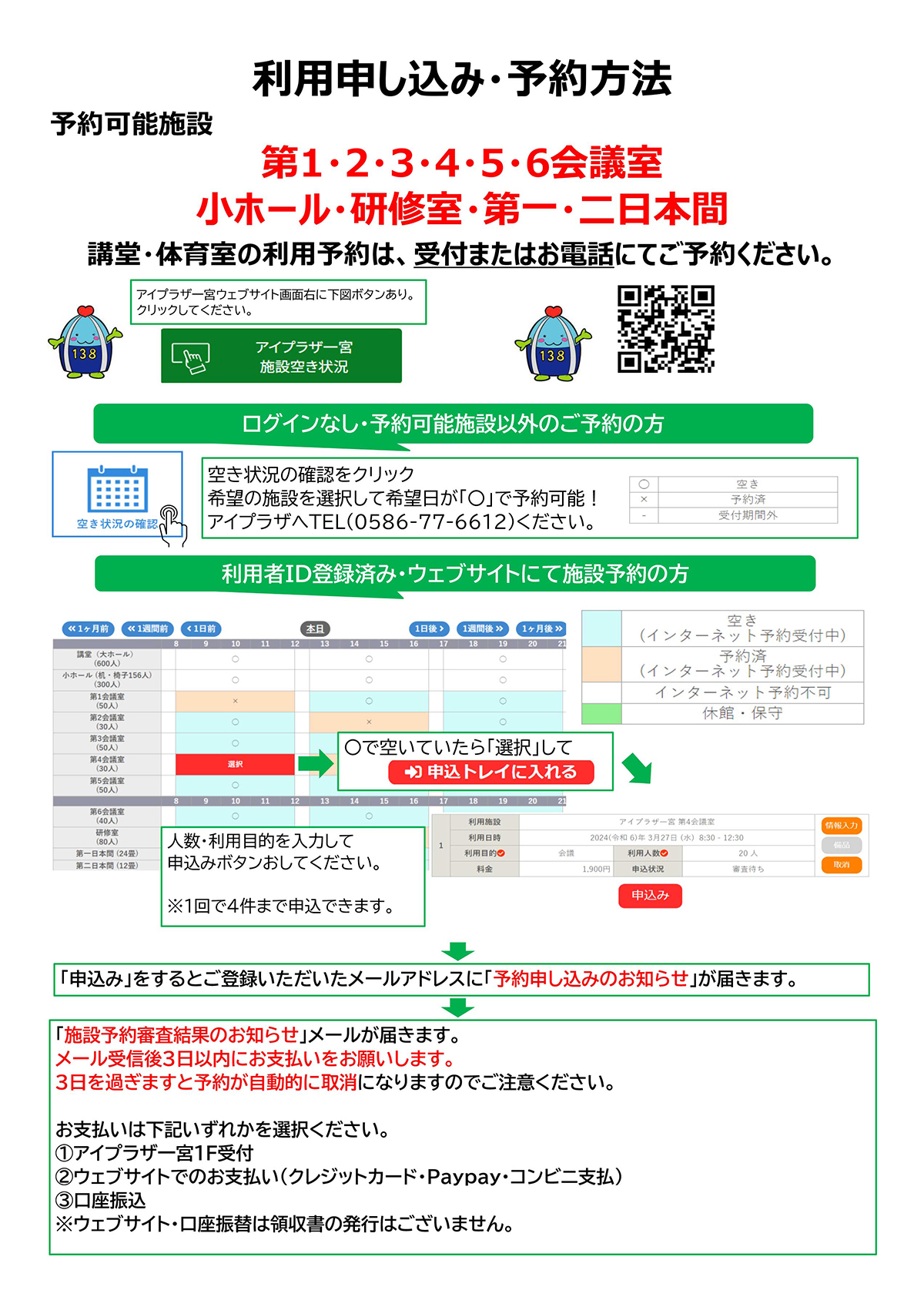 - ※口座振込で支払期日延期等は電話(0586-77-6612)またはメール(yoyaku@aiplaza-ichinomoiya.jp)にてご連絡ください。