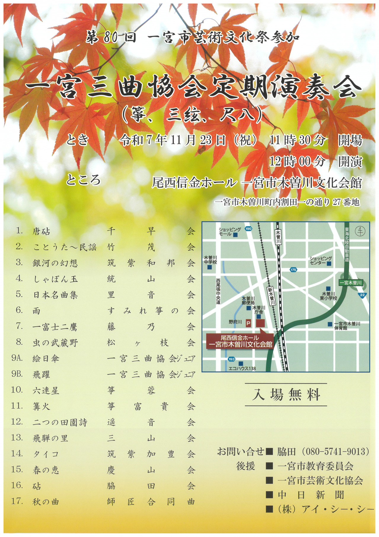 一宮三曲協会定期演奏会 2025年11月23日 貸館 第80回 一宮市芸術文化祭参加一宮三曲協会定期演奏会 (箏、三絃、尺八) 期日・日時 11月23日(祝) 開演 開場:11:30 開演:12:00 入場方法 ■入場無料 問い合わせ ■080-5741-9013 (脇田)