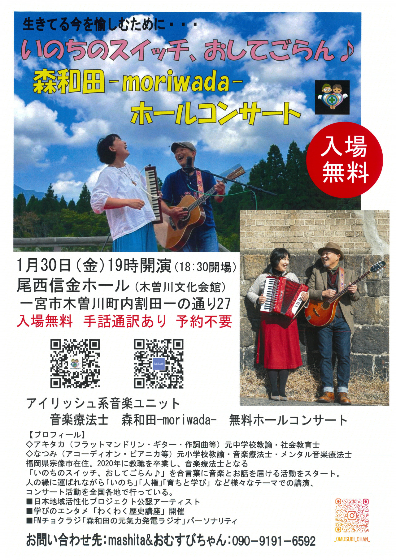 森和田-moriwada-ホールコンサート 2026年01月30日 貸館 生きてる今を愉しむために・・・いのちのスイッチ、おしてごらん♪ 期日・日時 1月30日(金) 開演 開場 18:30 開演 19:00 入場方法 ■入場無料 問い合わせ ■090-9191-6592 (mashita&おむすびちゃん)