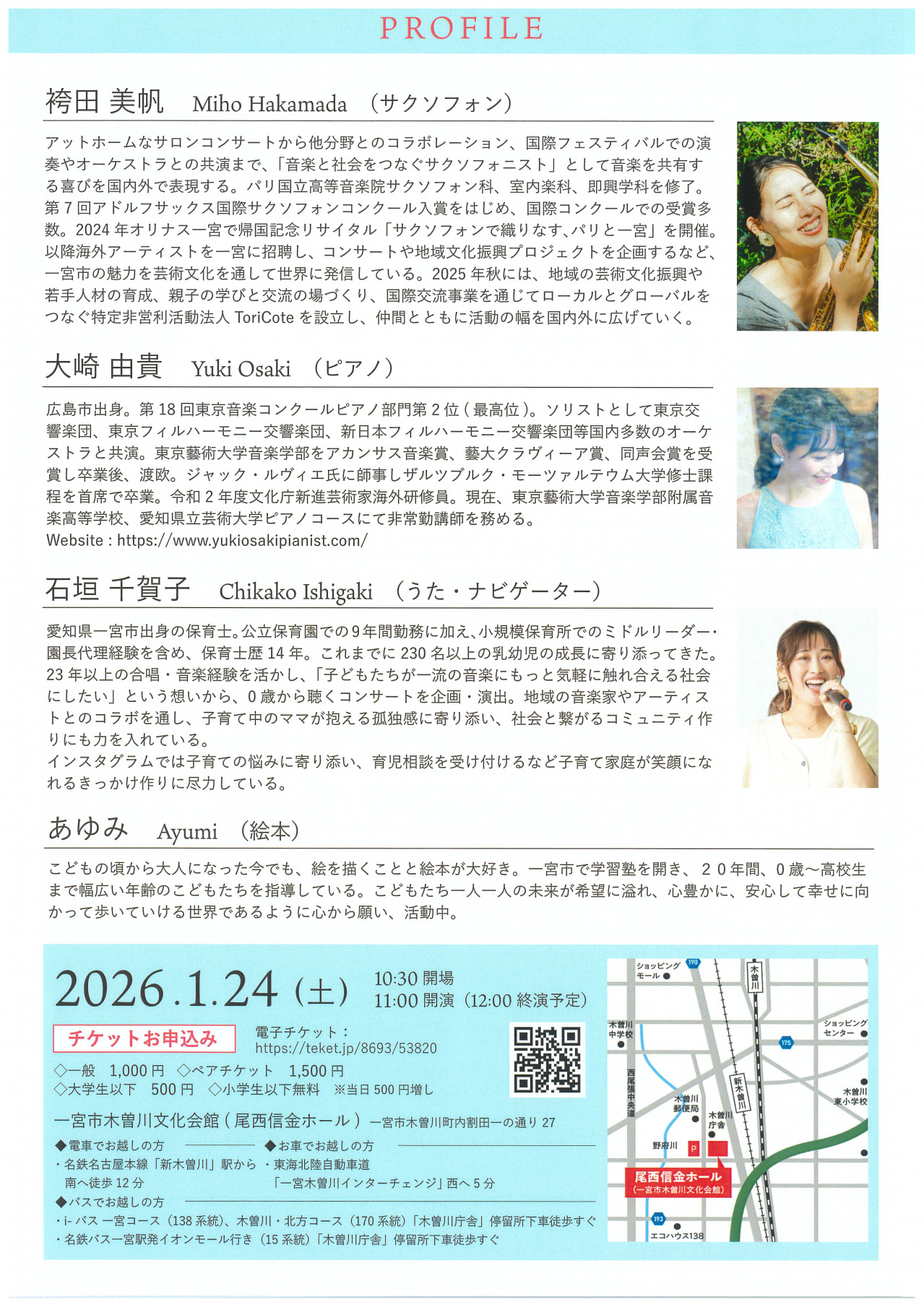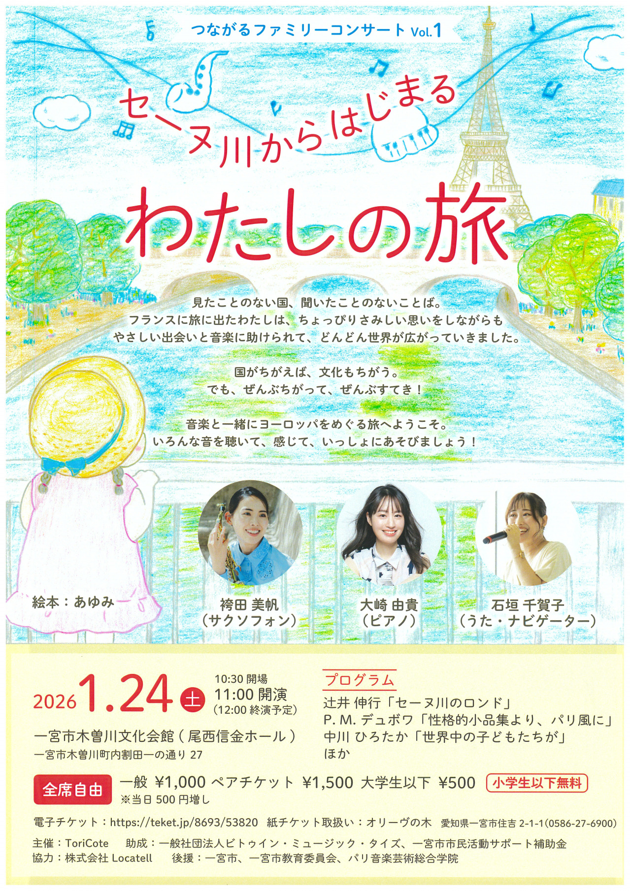 つながるファミリーコンサート Vol.1 2026年01月24日 貸館 セーヌ川からはじまる わたしの旅 期日・日時 1月24日(土) 開演 開場 10:30 開演 11:00 入場方法 ■全席自由 一般 1,000円 ペア 1,500円 大学生以下 500円 小学生以下 無料 ※当日 500円増 問い合わせ ■特定非営利活動法人 ToriCote E-mail:toricote.npo@gmail.com