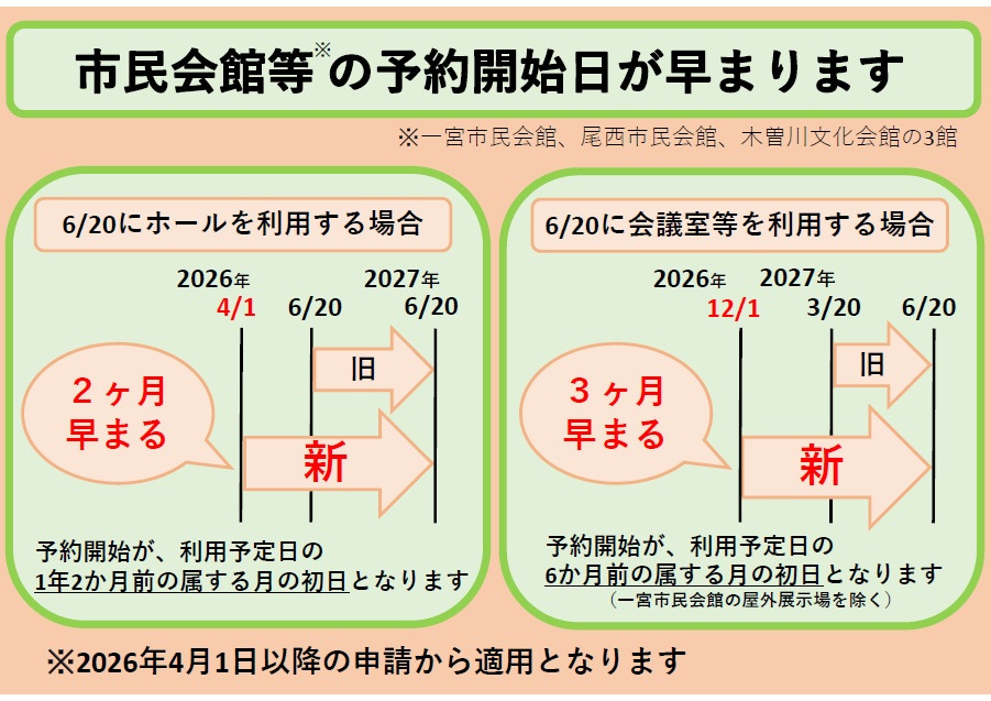 一宮市民会館及び一宮市尾西市民会館の利用時間、利用料金、3館全ての申請期間(申請開始日)が2026年4月1日より変更となります。