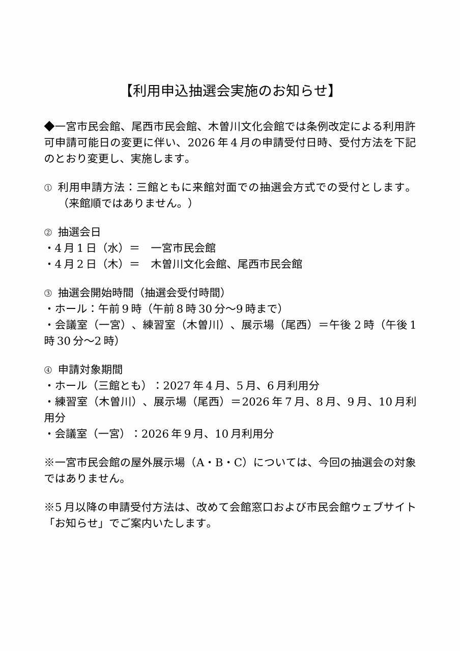 【重要】利用申込抽選会実施のお知らせ (一宮市民会館、尾西市民会館、木曽川文化会館(尾西信金ホール))