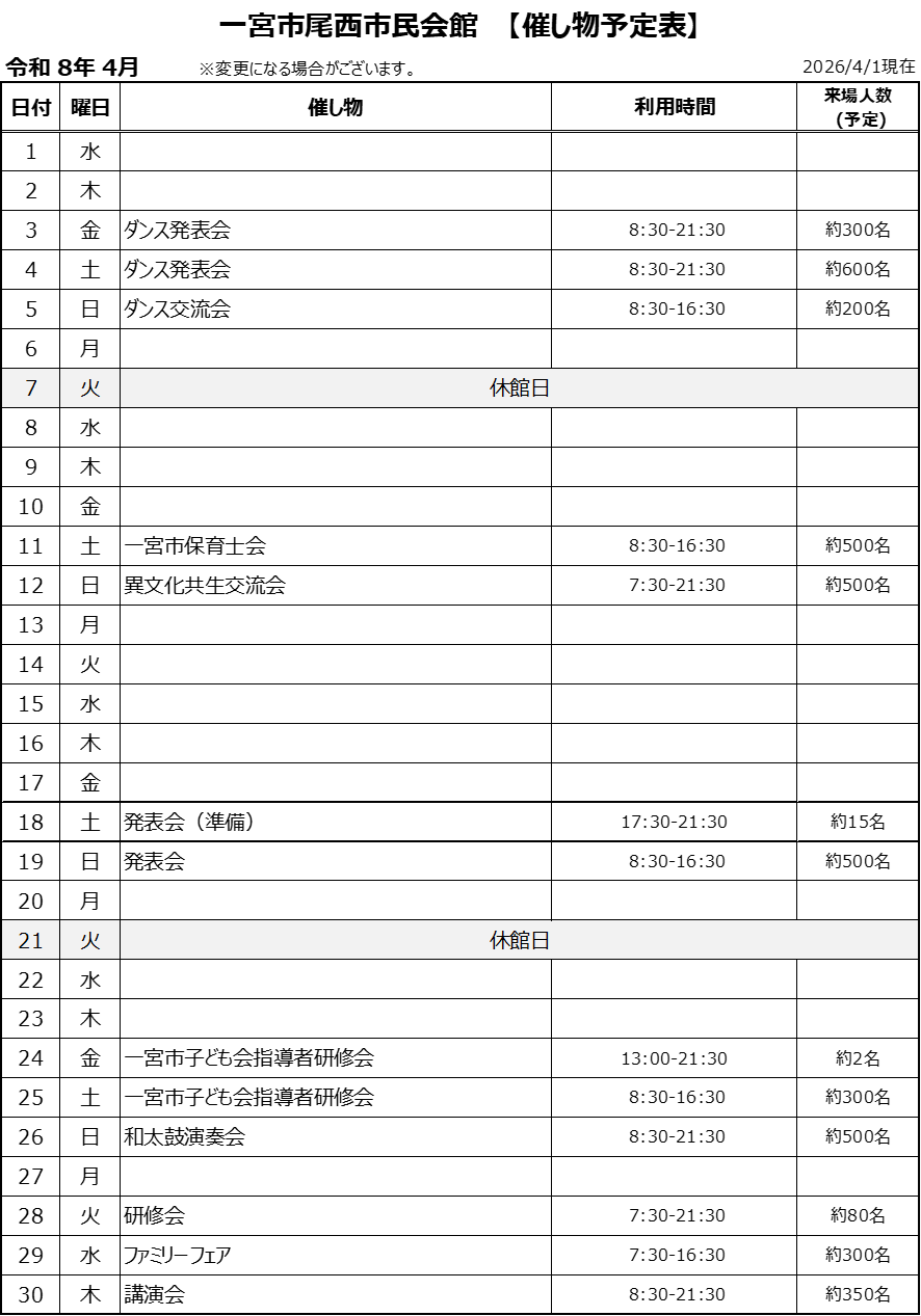 一宮市尾西市民会館4月・5月予定表 2026年04月01日 一宮市尾西市民会館の予定を下記一覧表でご確認ください。お車でご来場される場合は来場者数により駐車場が込み合う場合がございますのでご注意ください。※ご来場の際は、「尾西市民会館第1、第2駐車用」をご利用ください。 尾西市民会館駐車場図.pdf